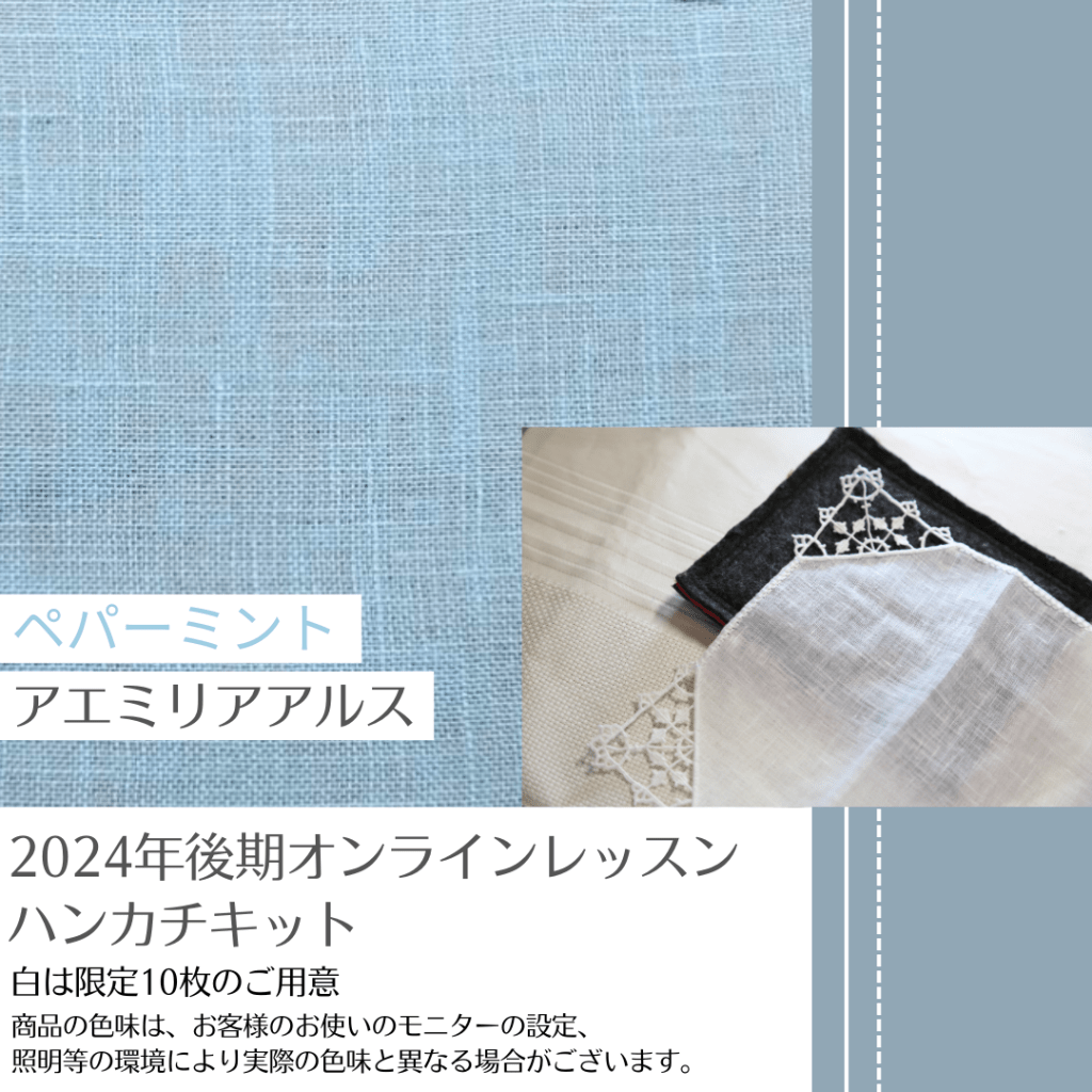 このレッスンでは、オンラインでアエミリアアルスの代表的なステッチを学び、ハンカチに縫い付けて仕上げます。