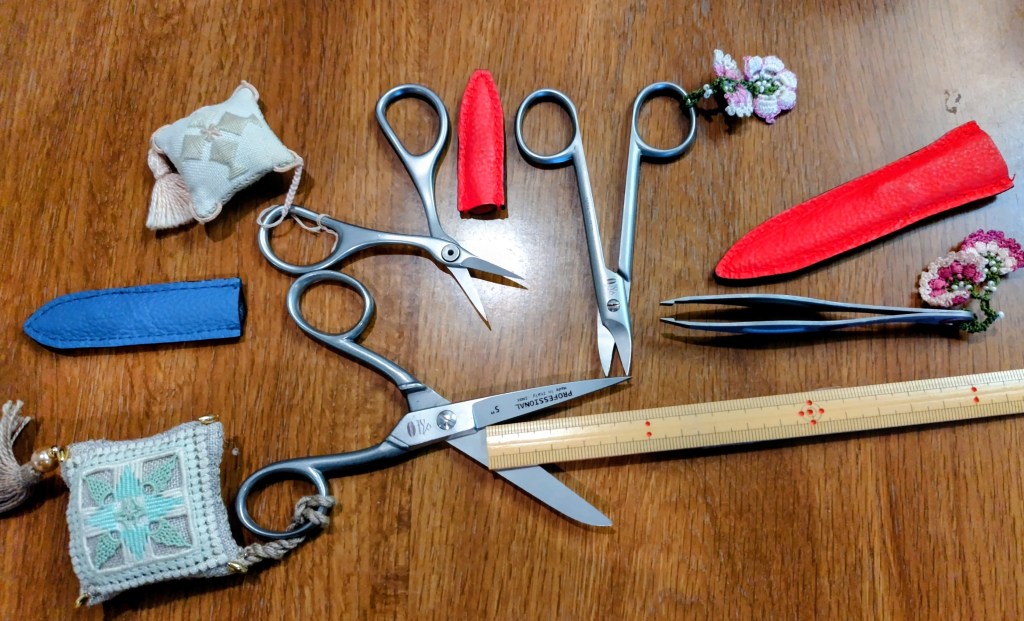 写真の右上から時計周りで、ピンセット、布用はさみ、糸切りばさみ、爪切りばさみ