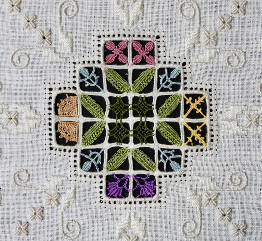 ヨーロッパ刺繍の原点と言われる精緻で美しい区限刺し、イタリア刺繍、プントアンティーコに魅せられ、ボローニャプントアンティーコ協会のBruna Gubbini (ブルーナ グッビーニ)さんから直接指導を受ける。
