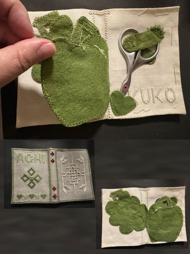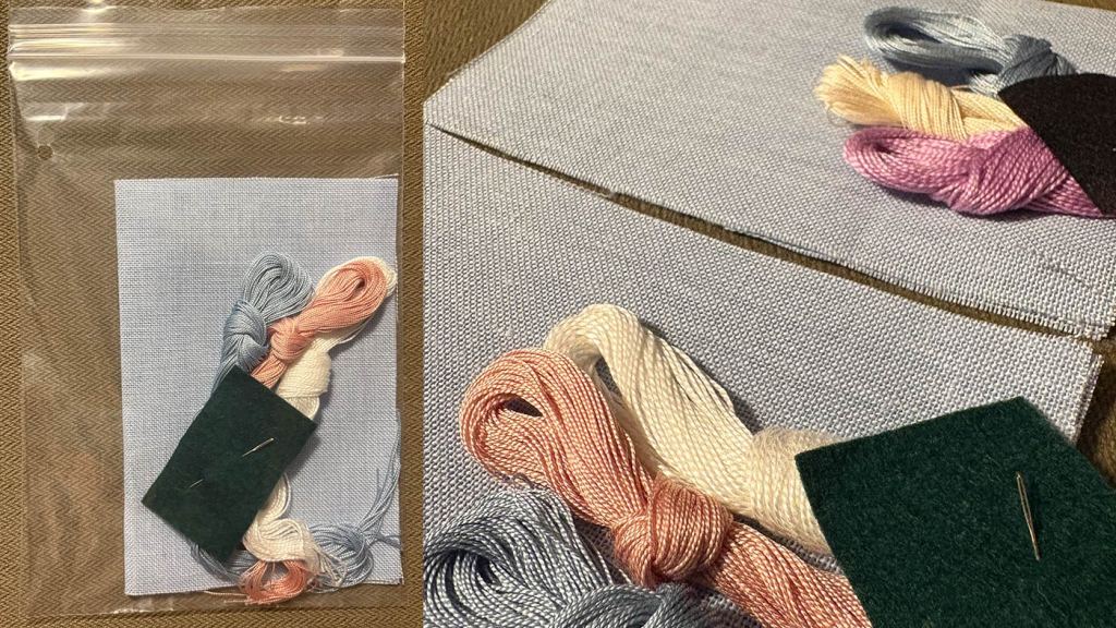 小さい作品を作ってみたい、大きな作品を作る前にステッチの練習したいという方にぴったりの、3色の糸と15×20cmの布、針のキットです。